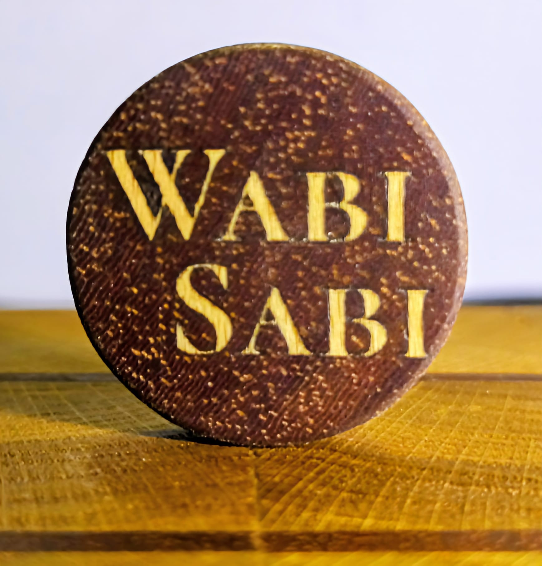 In meiner Hosentasche trage ich eine kleine Münze. Sie ist hergestellt aus Bongossi, kombiniert mit Buchenholz. Auf der einen Seite prangt mein Logo. Auf der anderen steht meine Philosophie: Wabi-Sabi.